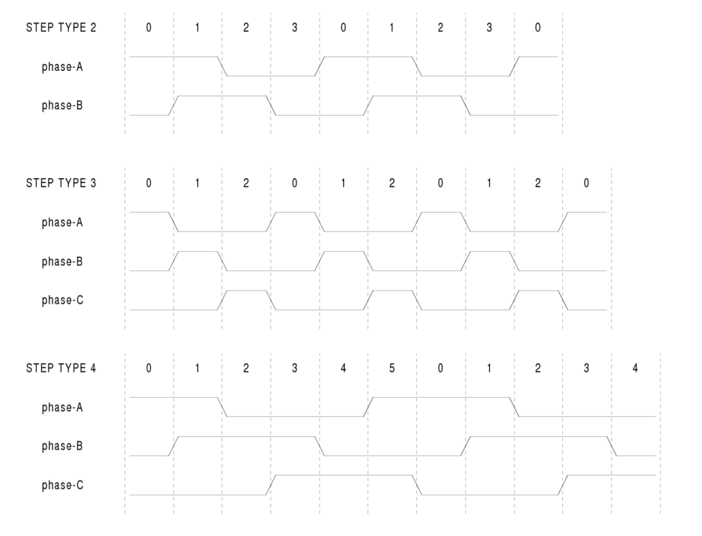 Step types 2 through 14 are state based, and have from two to five outputs. On each step, a state counter is incremented or decremented. Figures [.], [.], and [.] show the output patterns as a function of the state counter. The maximum frequency is 1,000,000,000 divided by steplen, and as in the other modes, maxfreq will be lowered if it is above the limit.