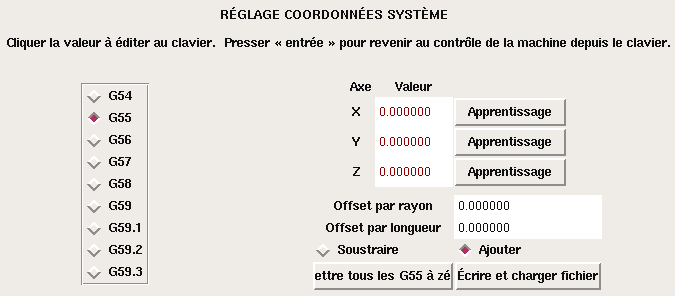 La page des offsets peut être utilisée pour afficher et ajuster les décalages d'origine des différents systèmes de coordonnées. Le système de coordonnées est choisi dans la colonne de gauche, par sélection d'une case à cocher. Quand un système de coordonnées est choisi il est possible d'entrer directement les valeurs ou de déplacer l'axe à une position d'apprentissage.