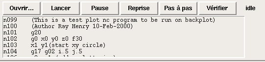 Le bouton Vérifier passe le code dans l’interpréteur sans production de mouvements. Si Vérifier trouve un problème il stoppe la lecture juste derrière le bloc posant problème et affiche un message. La plupart du temps vous serez en mesure de régler le problème avec votre programme par la lecture du message et en vérifiant la ligne de code en surbrillance dans la fenêtre du programme. Certains messages, toutefois, ne sont pas d’un grand secours. Parfois vous devrez lire une ou deux lignes en avant de celle en surbrillance pour voir le problème. Occasionnellement le message fait référence à quelque chose très en avant de la ligne en surbrillance. Le plus souvent ça se produit si vous oubliez de terminer votre programme par un code correct comme %, M2, M30, ou M60.