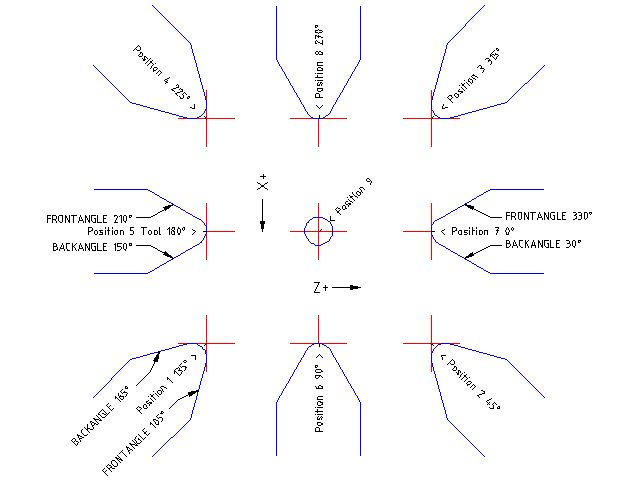 The following figure shows the lathe tool orientations with the center line angle of each orientation and info on FRONTANGLE and BACKANGLE. The FRONTANGLE and BACKANGLE are clockwise starting at a line parallel to Z+.