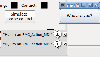 The buttons in the Commands frame are MDI Action widgets - pressing them will execute an MDI command in the interpreter. The third button Execute Oword subroutine is an advanced example - it takes several HAL pin values from the Settings frame, and passes them as parameters to the Oword subroutine. The actual parameters received by the routine are displayed by (DEBUG, ) commands - see ../../nc_files/oword.ngc for the subroutine body.